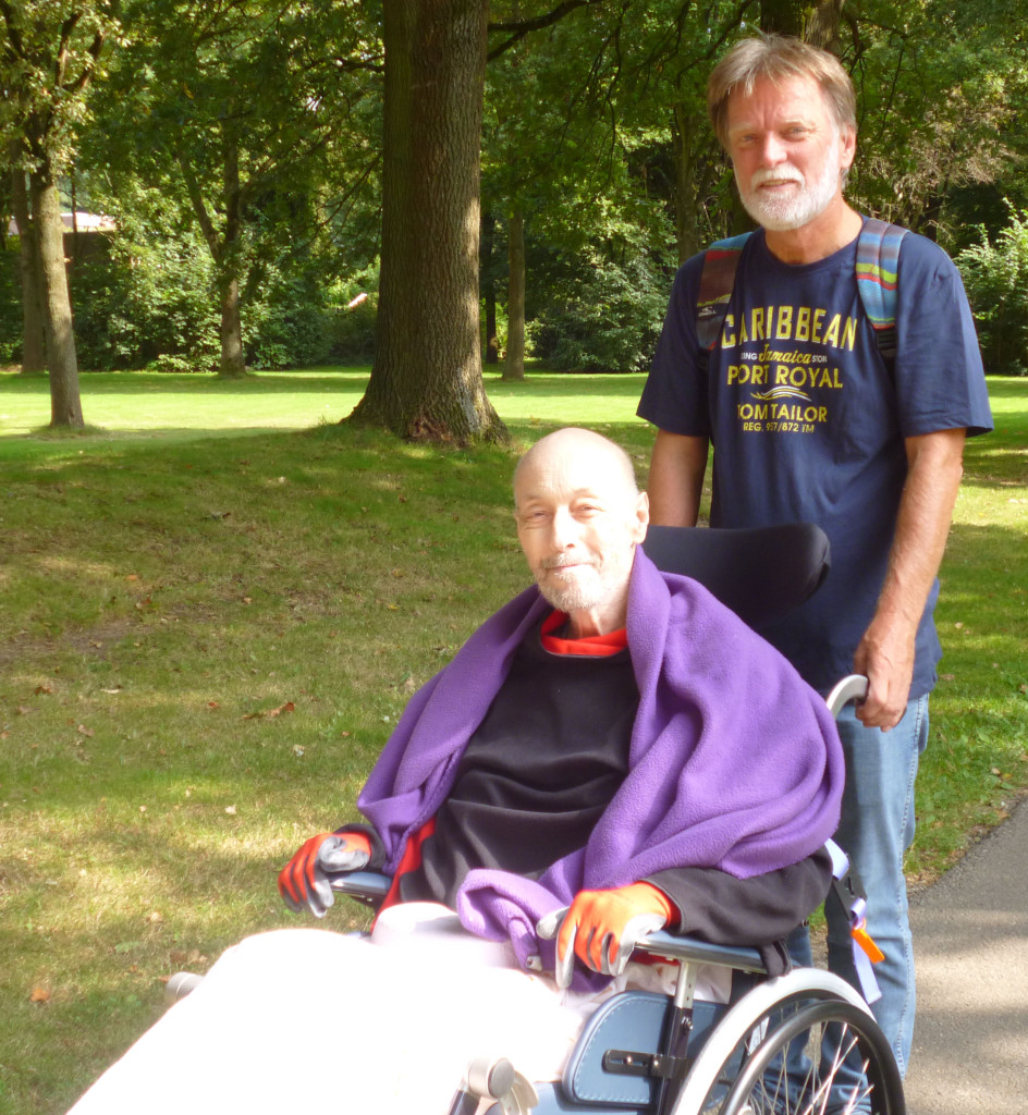 Hij verwaarloosde zichzelf (en ook de tuin en het huis) nogal en ik heb tijdens de opruiming (foto: stukje van de tuin) de indruk gekregen dat uitgaven plannen en een verstandig huishouden voeren ook zijn sterke punt niet was. Hij voelde zich veel te onafhankelijk om hulp te vragen aan anderen. Dat brak hem op toen zijn royale ontslagvergoeding op was. Op 24 mei 2014 werd hij in erbarmelijke toestand aangetroffen nadat zijn buurman geen reactie meer kreeg na aankloppen. Berend was heel ziek. Hij had een onbehandeld melanoom en ongediagnostiseerde ernstige diabetes. Omdat hij geen geld had voor de eigen bijdrage had hij niet naar de dokter willen gaan. Dat de dokter je heus niet laat stikken als je niet kunt betalen, wist hij wellicht niet. De buurman herinnert zich hem als iemand die altijd vond dat het lichaam zichzelf wel geneest, wat enigszins contrasteert met zijn felle afwijzing van ‘kwakzalvers’ – of misschien ook niet als je bedenkt dat kwakzalvers vaak goede sier maken met het natuurlijk verloop van een ziekte en hij dat natuurlijk wist. Na een korte behandeling in het ziekenhuis werd hij opgenomen in verpleeghuis De Horst in Emmen. Daar leerde hij een zekere Geert beter kennen, die hij al eens was tegengekomen bij de kerstmaaltijd in 2013 in Huize Spoorloos. Berend sprak veel met Geert, en veel van dit verhaal is gebaseerd op wat Geert me heeft verteld. De afbeelding bij het begin van dit stuk toont Geert die Berend rondrijdt in de omgeving van De Horst.